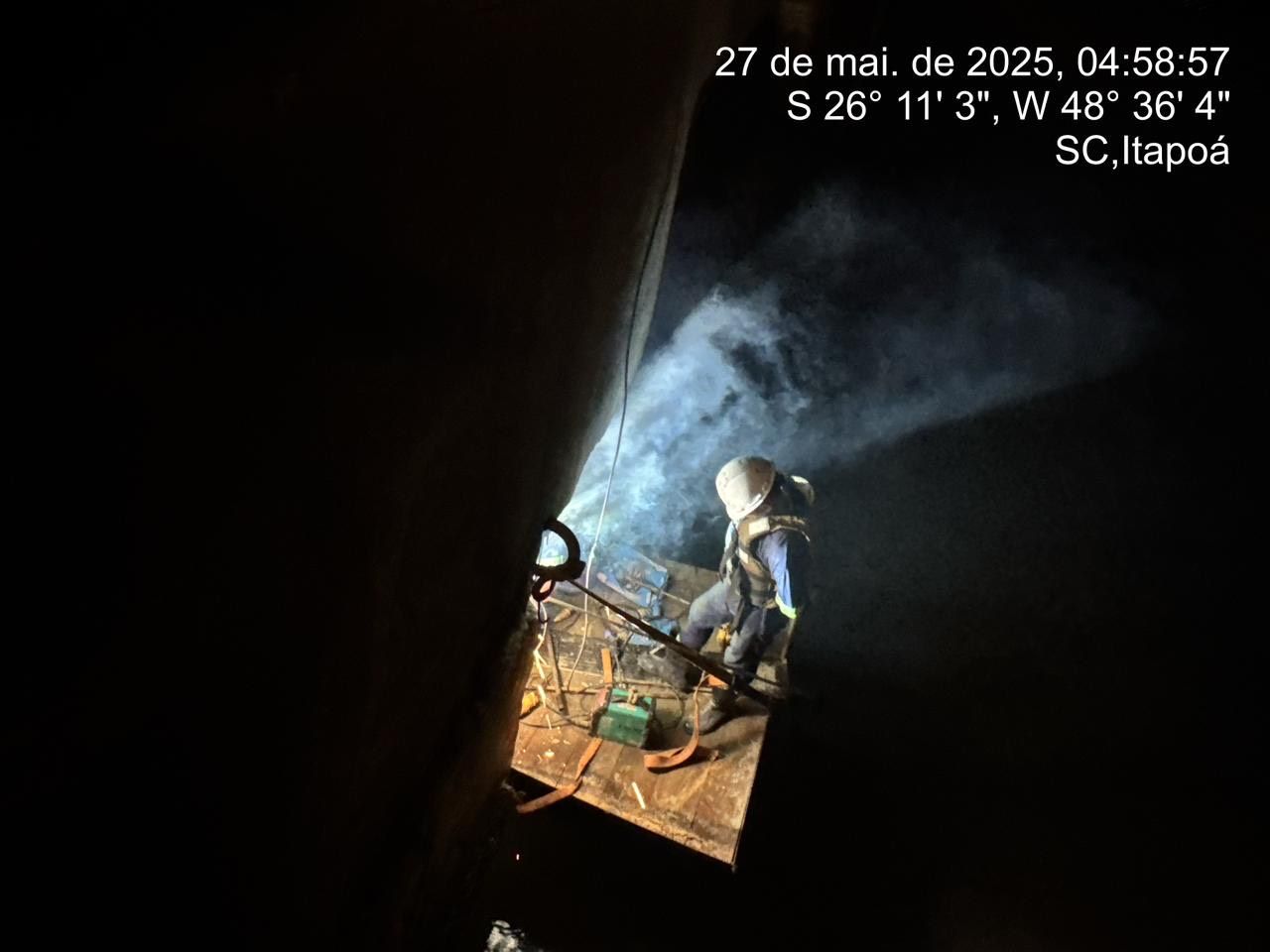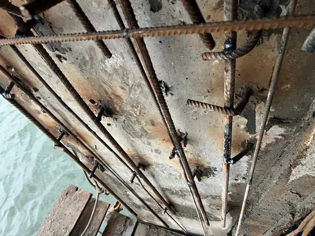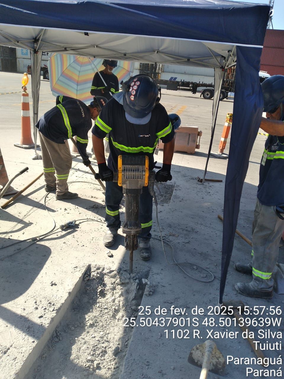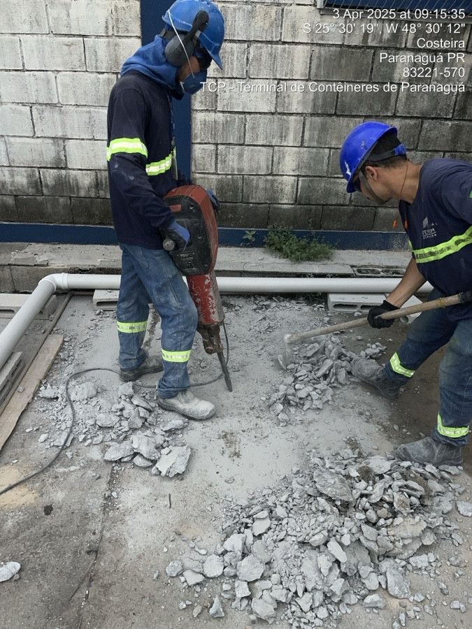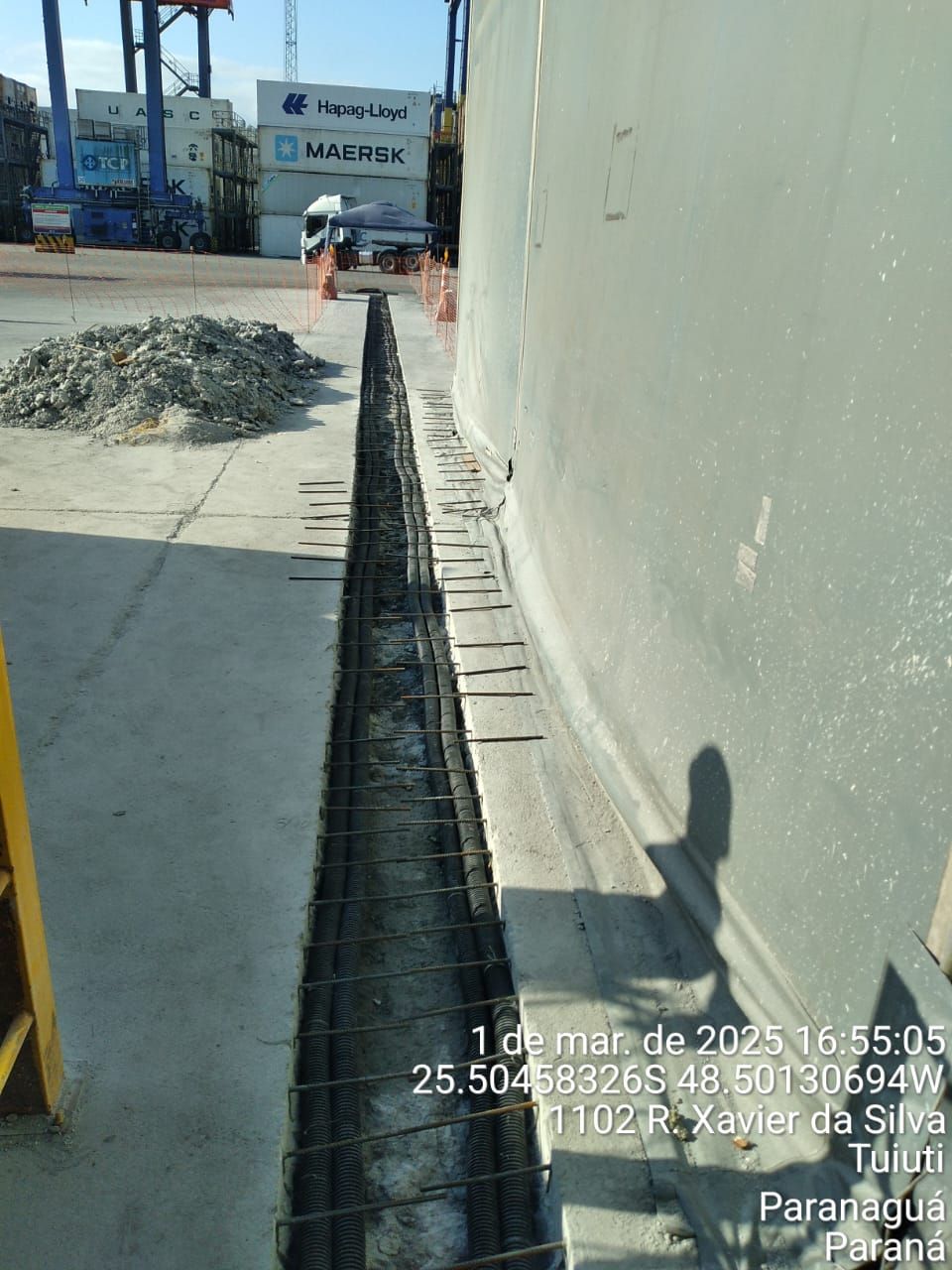 A intervenção demandou a abertura controlada de áreas no piso de concreto do terminal, seguida da soldagem minuciosa de novas armaduras à ferragem existente da estrutura portuária, garantindo continuidade estrutural e integridade da laje.
