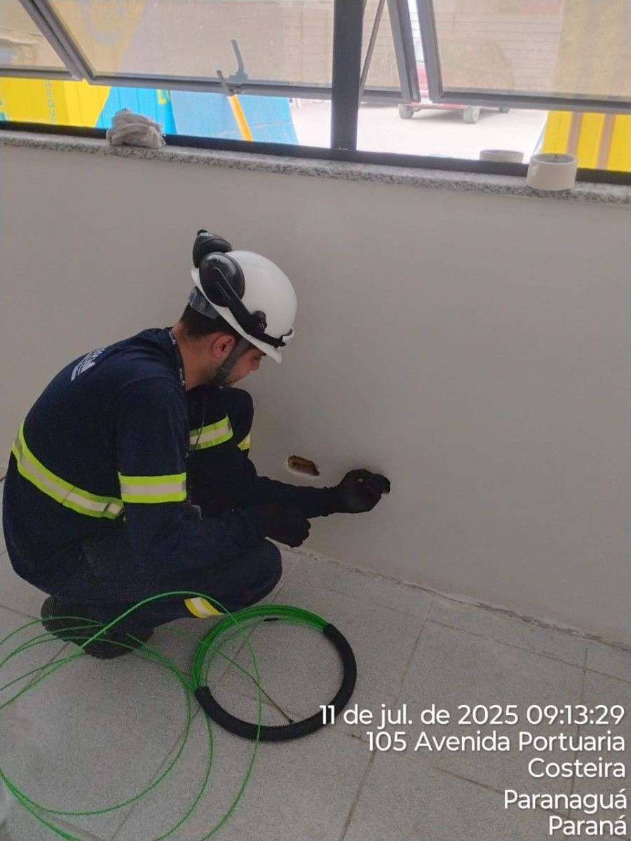 A intervenção exigiu a derivação de ramais de energia elétrica e rede de dados diretamente no piso de concreto armado do terminal, processo que demandou rigoroso controle técnico para abertura, execução e recomposição do pavimento conforme procedimentos específicos.